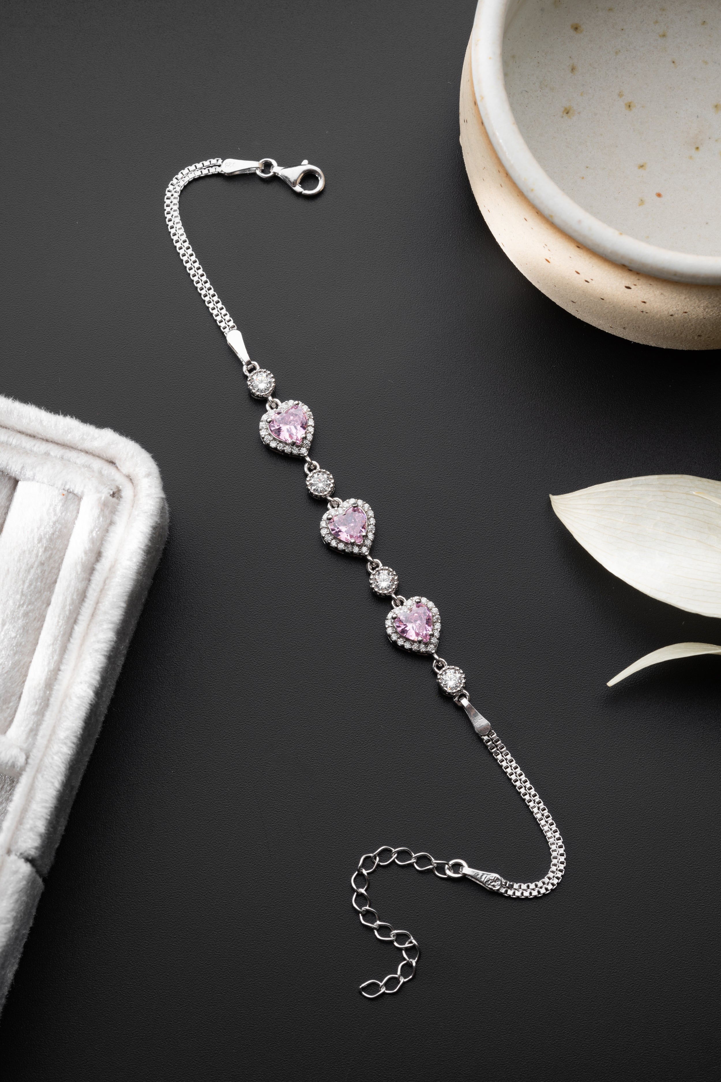 Alternating Brilliance: The design is accented with high-clarity round stones between each heart, ensuring a continuous flow of light around your wrist.