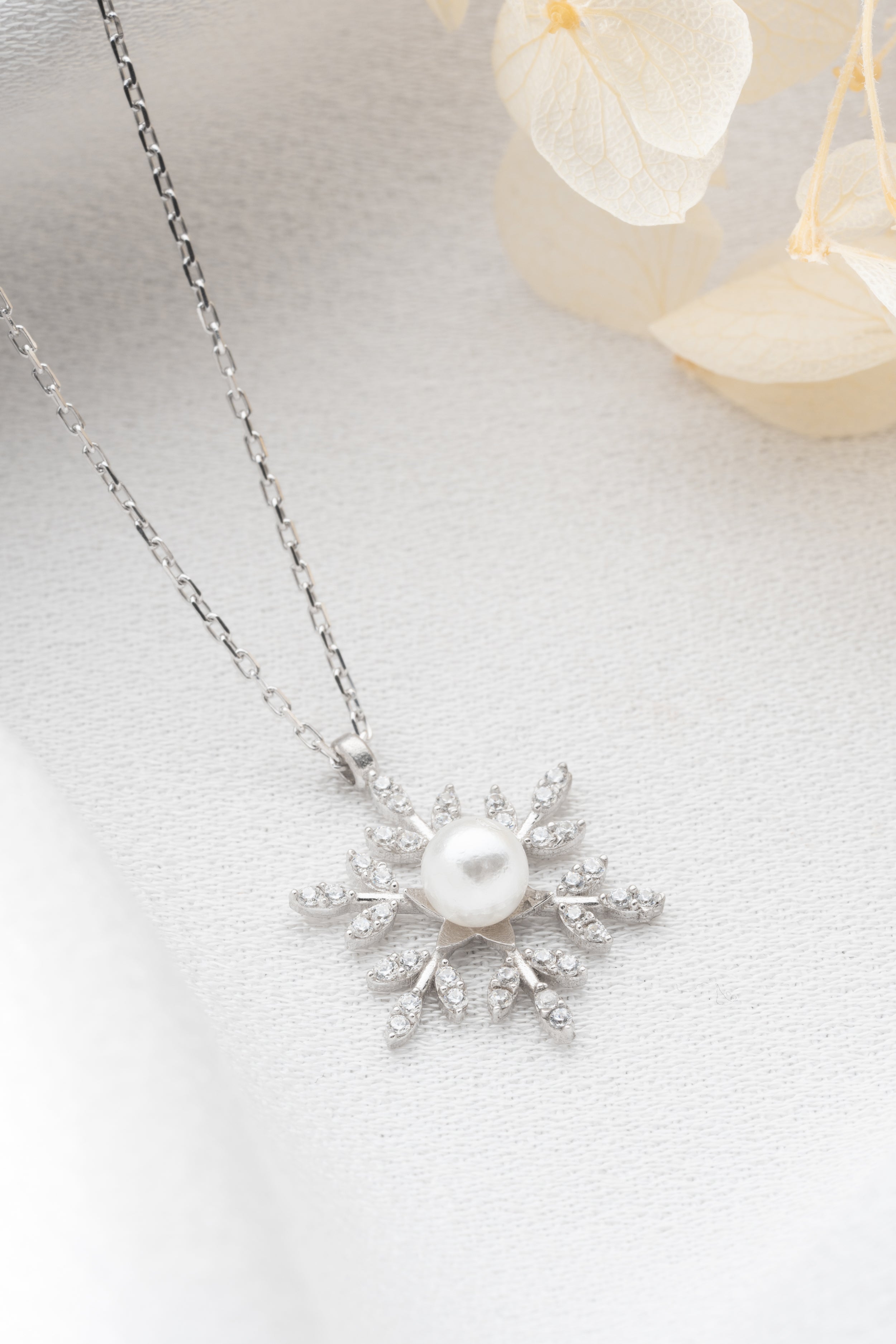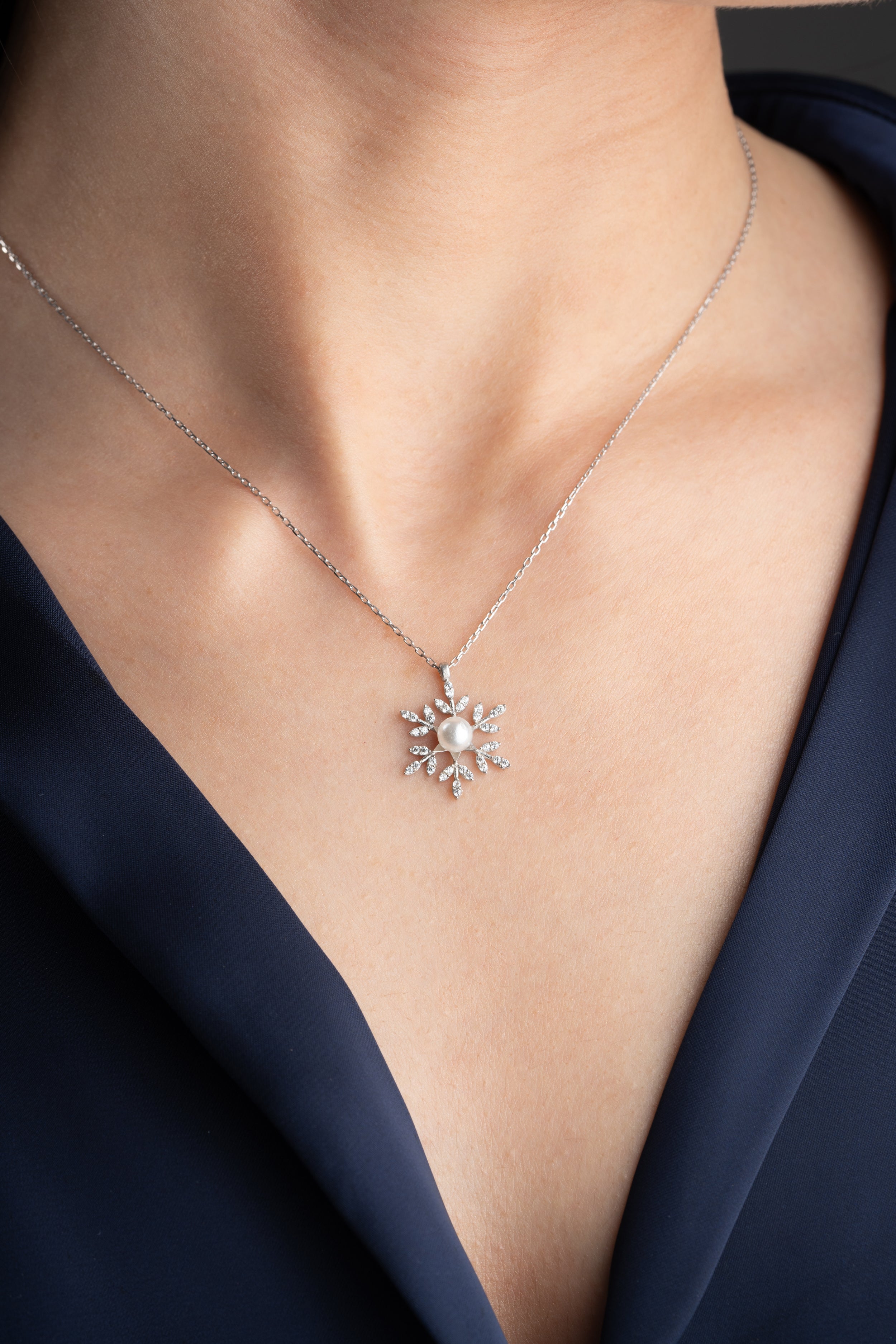 The Winter Queen: A Symphony of Pearl and Ice Embrace the serene beauty of a winter morning with the Velanvoir Ethereal Snowflake Pearl Necklace. This exquisite piece features a lustrous, high-luster pearl nestled at the heart of a delicately crafted snowflake. Each branch of the snowflake is adorned with shimmering micro-crystals, creating a piece that captures the fleeting magic of frost and the timeless elegance of the sea.